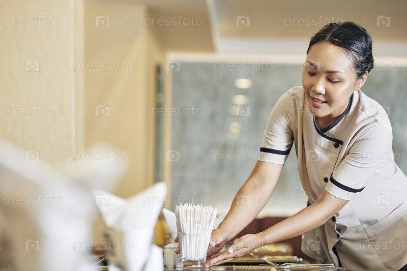 Официантка кладет салфетки на стол