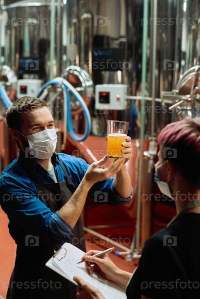 Молодой пивовар, держащий стакан пива и обсуждающий его характеристики с коллегой