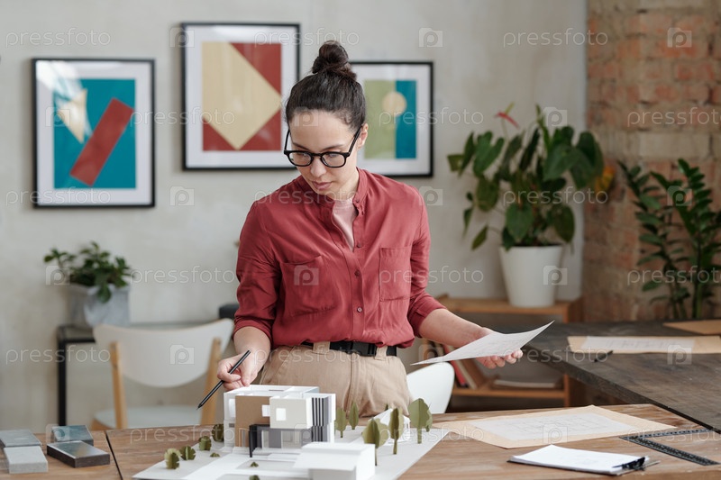 Молодая элегантная женщина-архитектор с бумагой и ручкой стоит за столом с моделью нового дома и двора