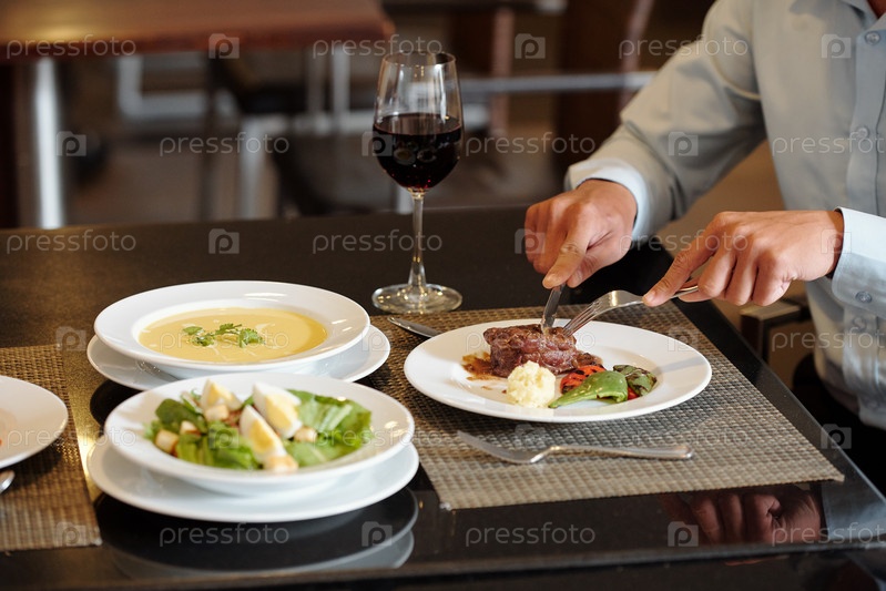 Мужчина режет стейк