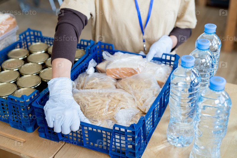 Человек в перчатках кладет на стол большую коробку с продуктами питания