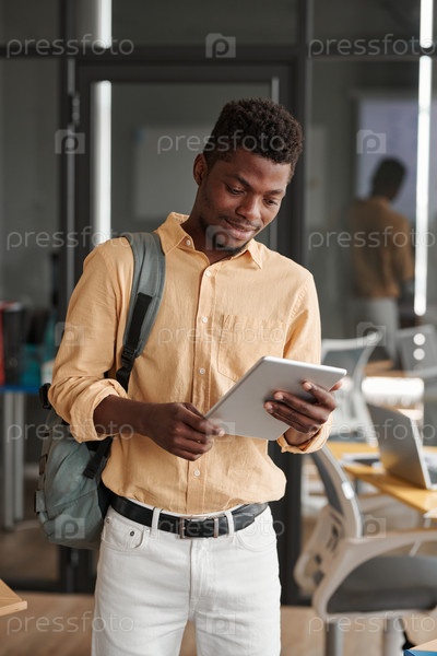 Черный парень проверяет информацию на планшете
