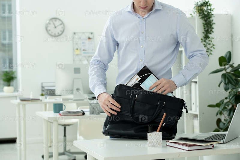 Бизнесмен кладет защитную маску и буфер с документом в сумочку