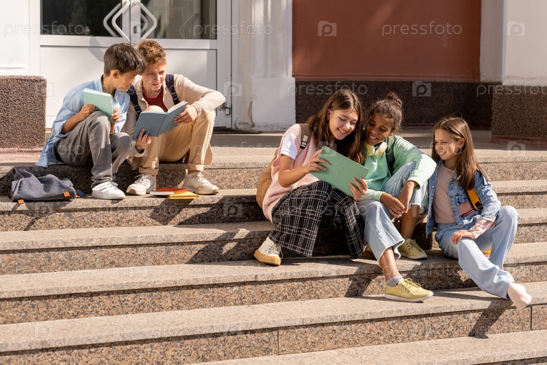 Группа школьников-подростков, использующих планшеты во время сидения на лестнице