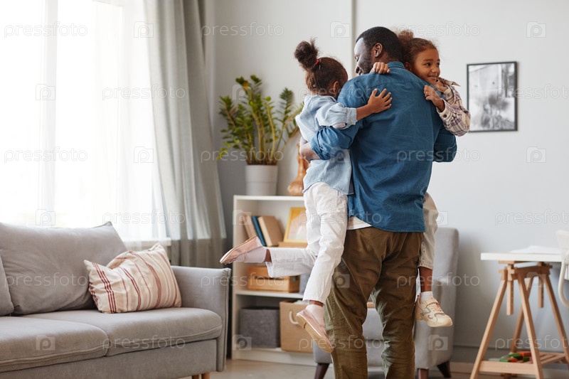 Афроамериканский отец, держащий в руках двух счастливых девочек