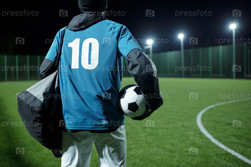 Задний вид футболиста с сумкой и футбольным мячом
