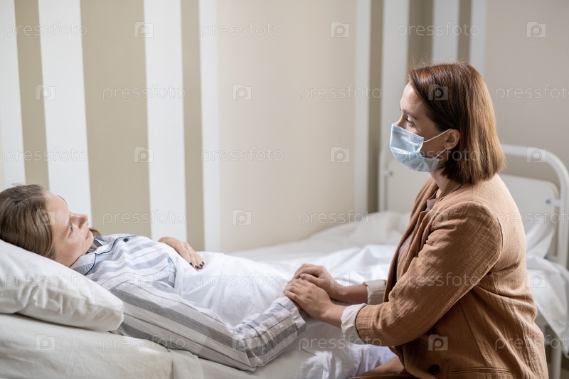 Молодая брюнетка в защитной маске держит за руку свою подругу с коронавирусом