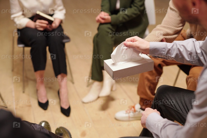 Один из пациентов группы психической поддержки вынимает платок из коробки, которую держал другой мужчина