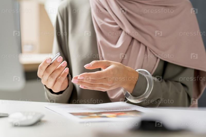 Руки молодого учителя с ручкой, сидящего за столом во время онлайн-урока
