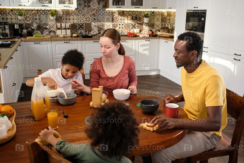 Современная межнациональная семья завтракает за столом