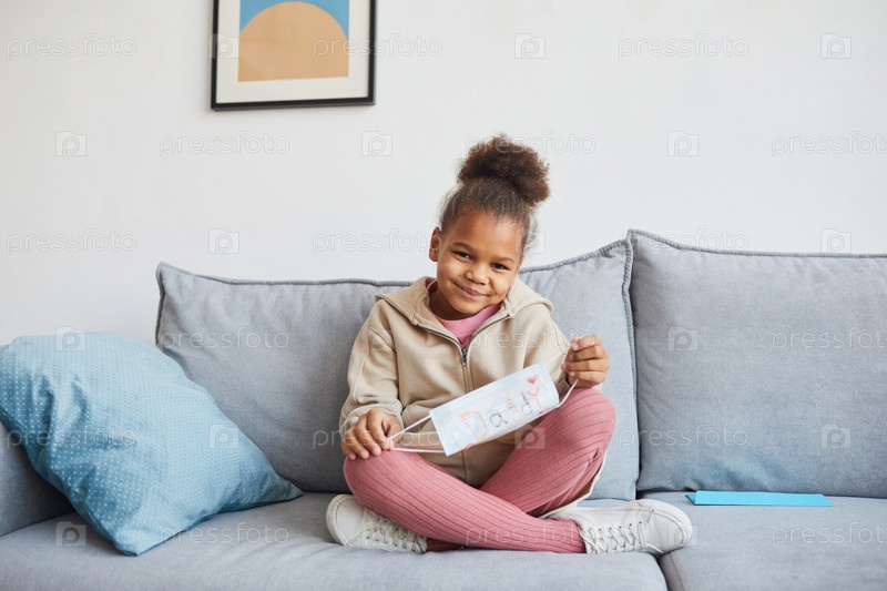 Милая девушка держит маску на лице дома