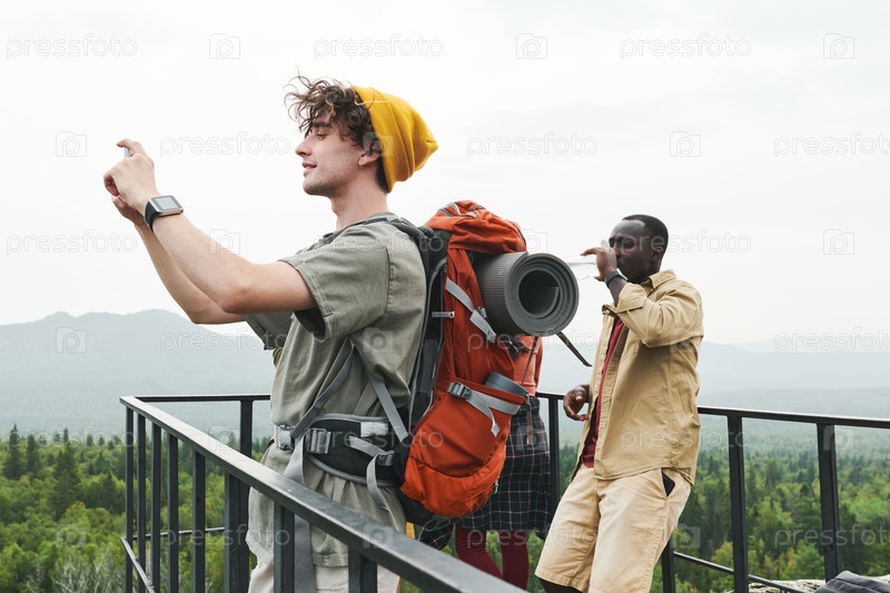 Улыбающийся молодой турист с рюкзаком стоит на мосту и экономит моменты, фотографируя ландшафт по телефону