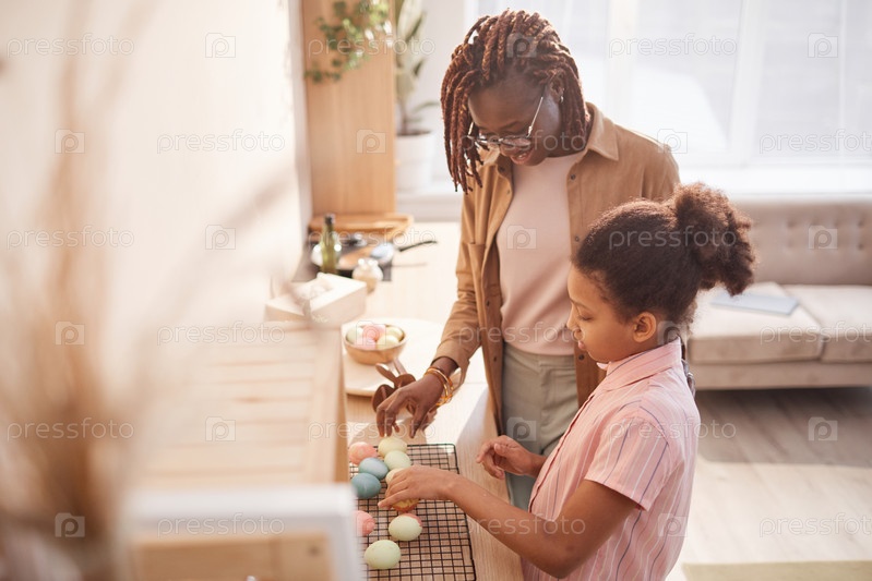 Афроамериканская мать и дочь делают пасхальное украшение