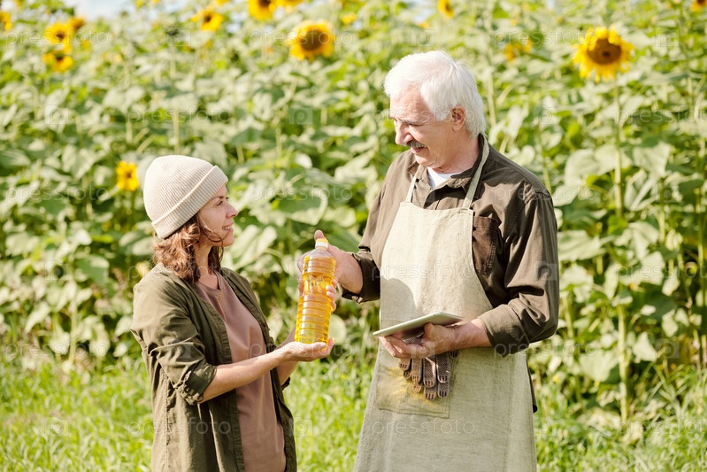 Счастливый старший фермер-мужчина в рабочей одежде, передающий бутылку подсолнечного масла женщине