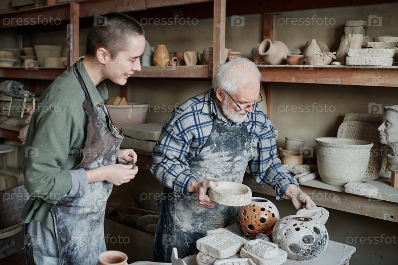 Люди скульптурируют керамические вазы в мастерской