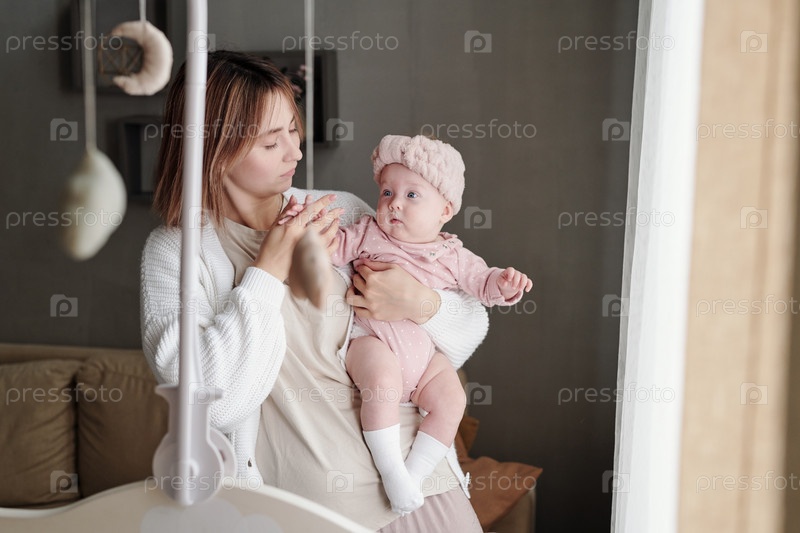 Молодая мать внимательно смотрит на свою очаровательную дочь