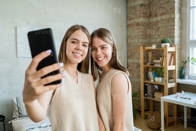 Одна из девочек-близнецов со смартфоном делает селфи с сестрой