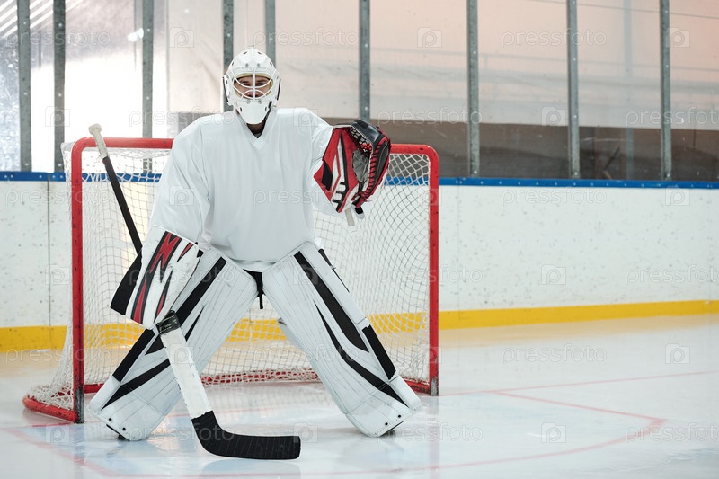 Хоккеист в спортивной форме, защитный шлем и перчатки с палочкой