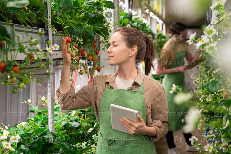 Женщина держит сенсорный планшет, глядя на клубничные саженцы