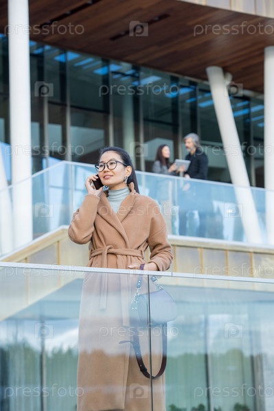 Молодая азиатская бизнесвумен в элегантном бежевом пальто разговаривает по мобильному телефону