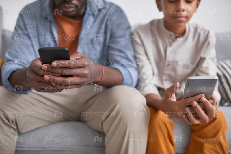 Мужчина и мальчик используют смартфоны