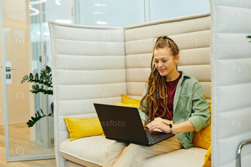Уверенная в себе молодая женщина-менеджер офиса в повседневной одежде общается на диване