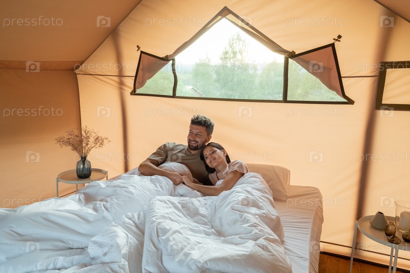 Любящая пара сидит в постели под белыми простынями