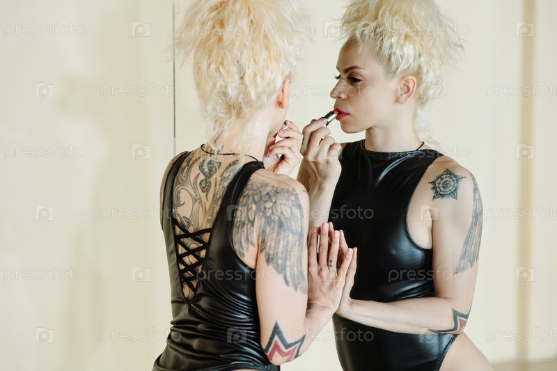 Женщина-танцовщица наносит помаду
