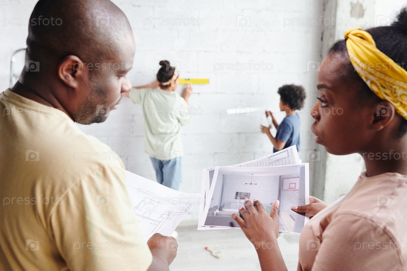 Молодой муж и жена в повседневной одежде обсуждают документы с проектом и интерьером гостиной