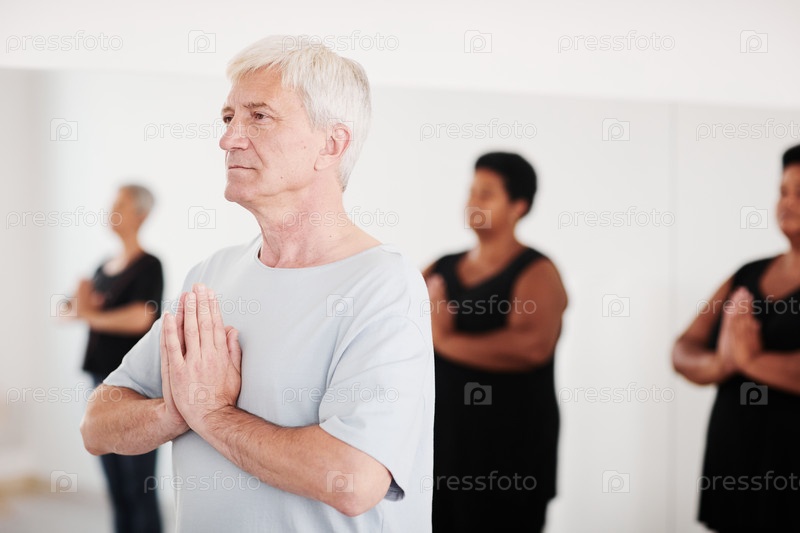 Старший мужчина медитирует во время занятий йогой