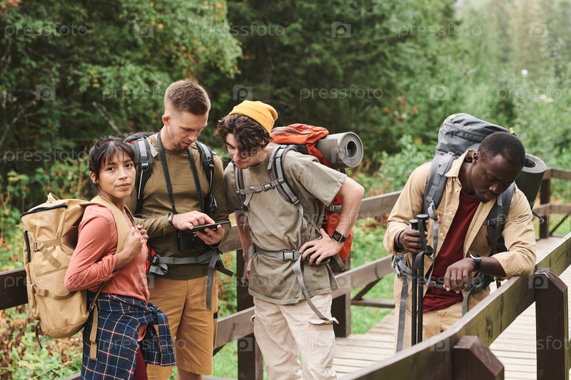 Группа молодых многонациональных туристов с рюкзаками, стоящих на мосту в лесу и анализирующих маршрут по телефону