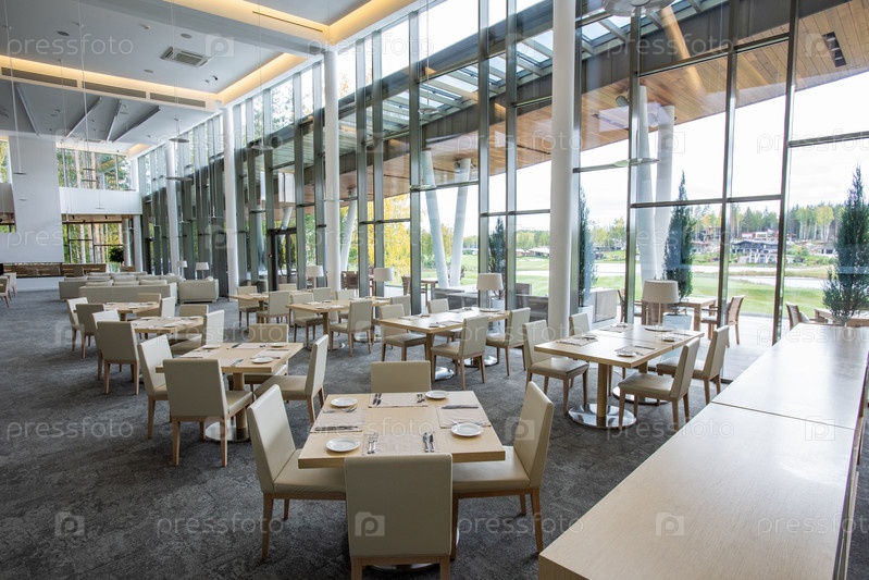 Два ряда столов подаются для гостей в роскошном ресторане бизнес-центра