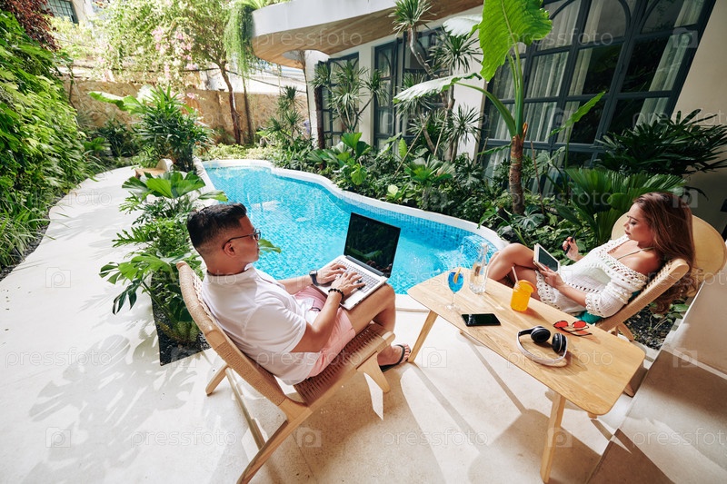Пара, работающая у бассейна