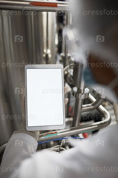 Работник, держащий цифровой планшет на фабрике Mock Up