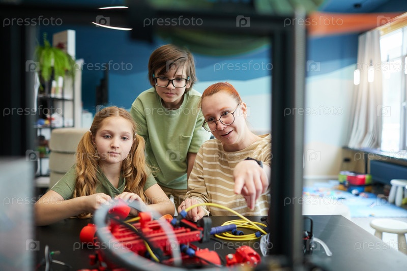 Дети, использующие 3D-принтер в инженерной лаборатории