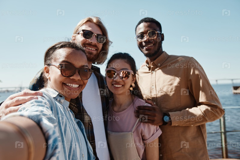Группа друзей, делающих селфи на свежем воздухе