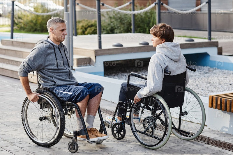 Зрелая пара с инвалидностью гуляет на свежем воздухе