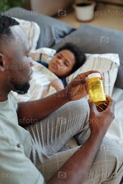 Молодой осторожный отец держит бутылку с таблетками, сидя на кровати рядом со своим больным маленьким сыном