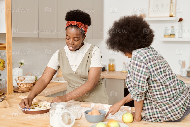 Молодая африканская женщина готовит яблочный пирог со своим милым сыном, сидящим рядом