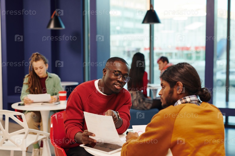 Два молодых современных межкультурных бизнесмена в повседневной одежде, смотрящих на бумагу
