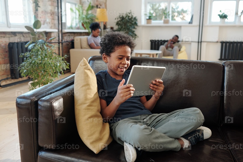 Маленький мальчик в повседневной одежде смотрит на экран планшета с улыбкой, сидя на кожаном диване