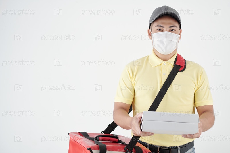 Доставщик дарит коробки пиццы