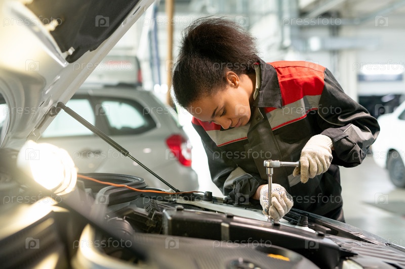 Профессиональный техник авторемонтного сервиса, использующий инструмент для исправления мелких деталей