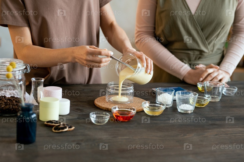 Молодая женщина кладет каплю ручной массы жидкого мыла на ладонь своей подруги