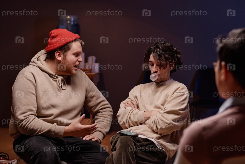 Горизонтальный снимок двух молодых мужчин, моделирующих ситуацию во время групповой драматической психотерапии