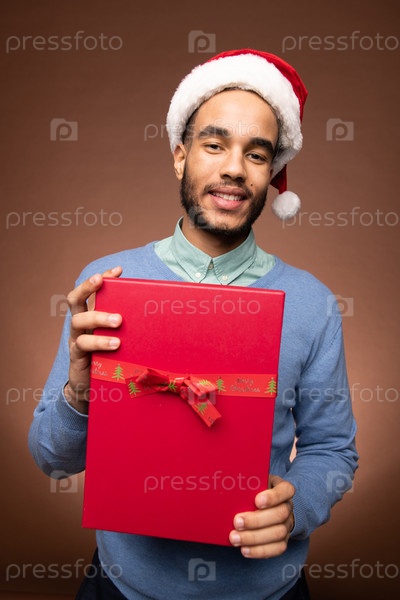 Счастливый молодой человек смешанной расы в умном повседневной одежде и шляпе Санты, держащей красную подарочную коробку