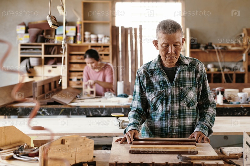 Пенсивный плотник смотрит на деревянные изделия