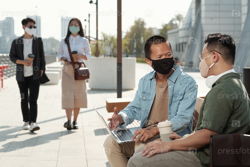 Молодой бизнесмен в защитной маске разговаривает с коллегой