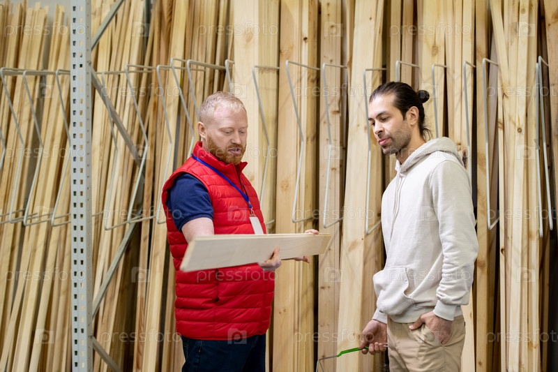 Помощник магазина помогает молодому человеку выбрать деревянную доску