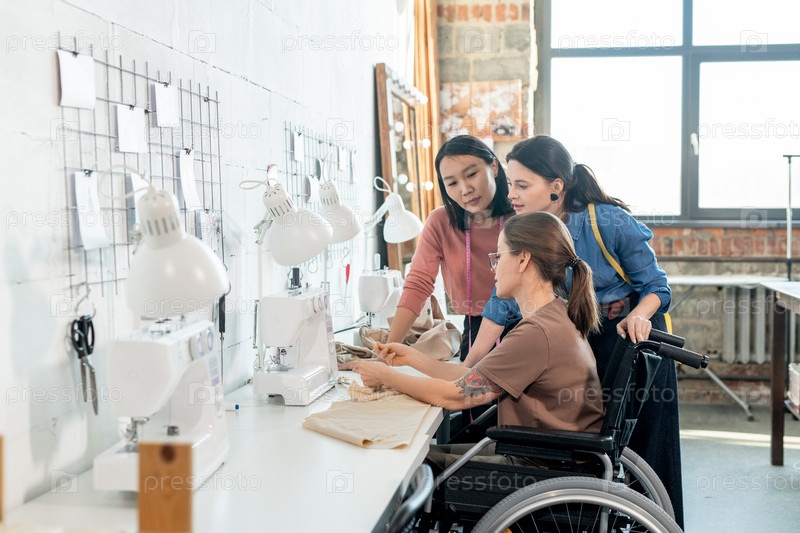 Две молодые женщины-модные дизайнеры консультируются с Seamtsress в инвалидном кресле во время обсуждения